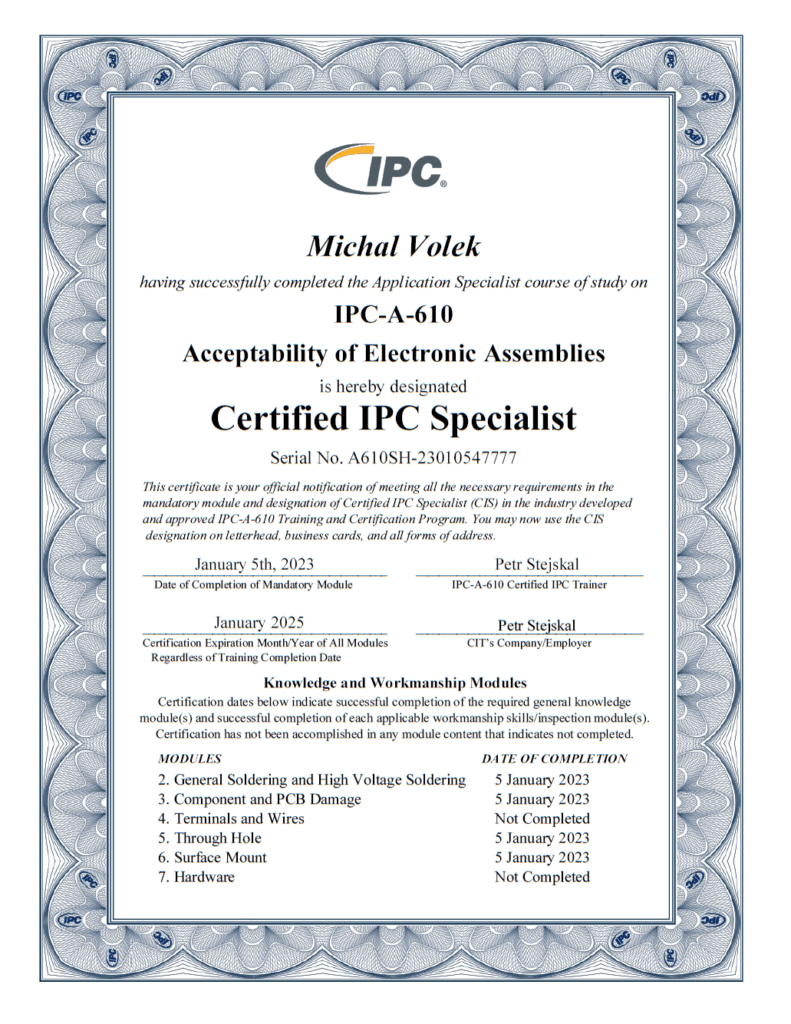 V procesu výroby používáme bezolovnaté pájení dle norem ROHS a REACH. Naši vybraní zaměstnanci absolvují jednou za dva roky školení normy IPC-A-610 Přijatelnost elektronických sestav.